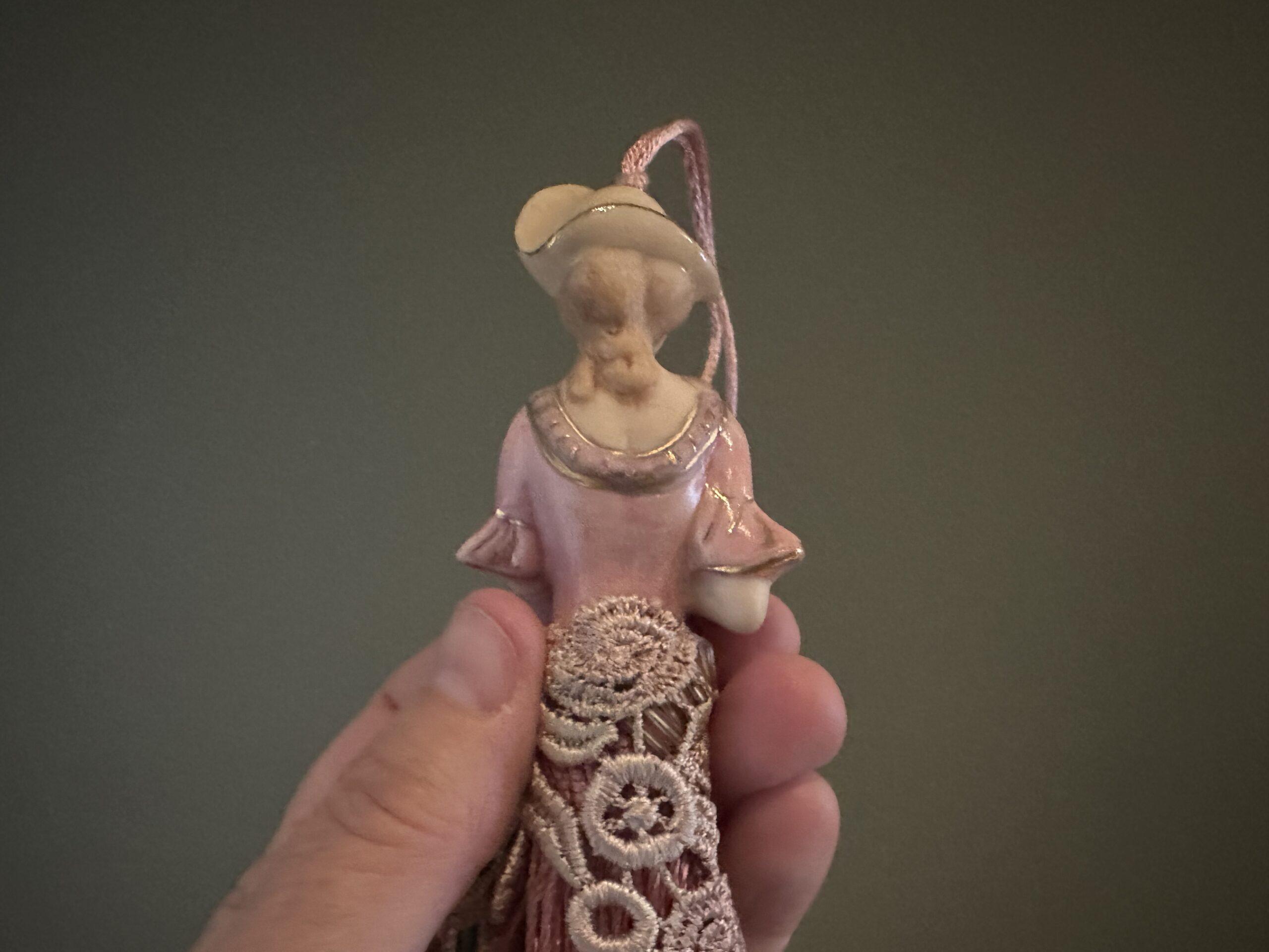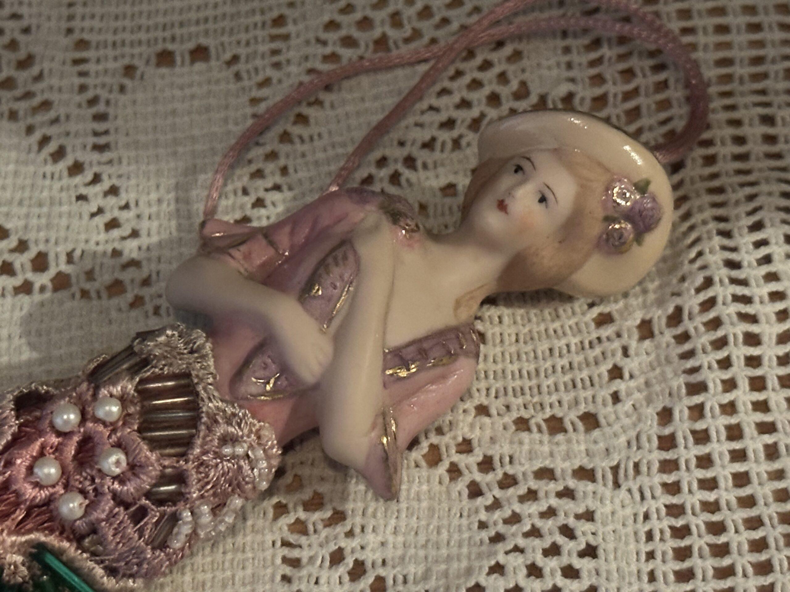 This lovely tassel doll has been hand painted, and has gilt trim and beads and pearls on her skirt. She measures 19.5 cm in length not including her hanging cord. I cant find any markings to say where she was made, but she is in lovely condition.