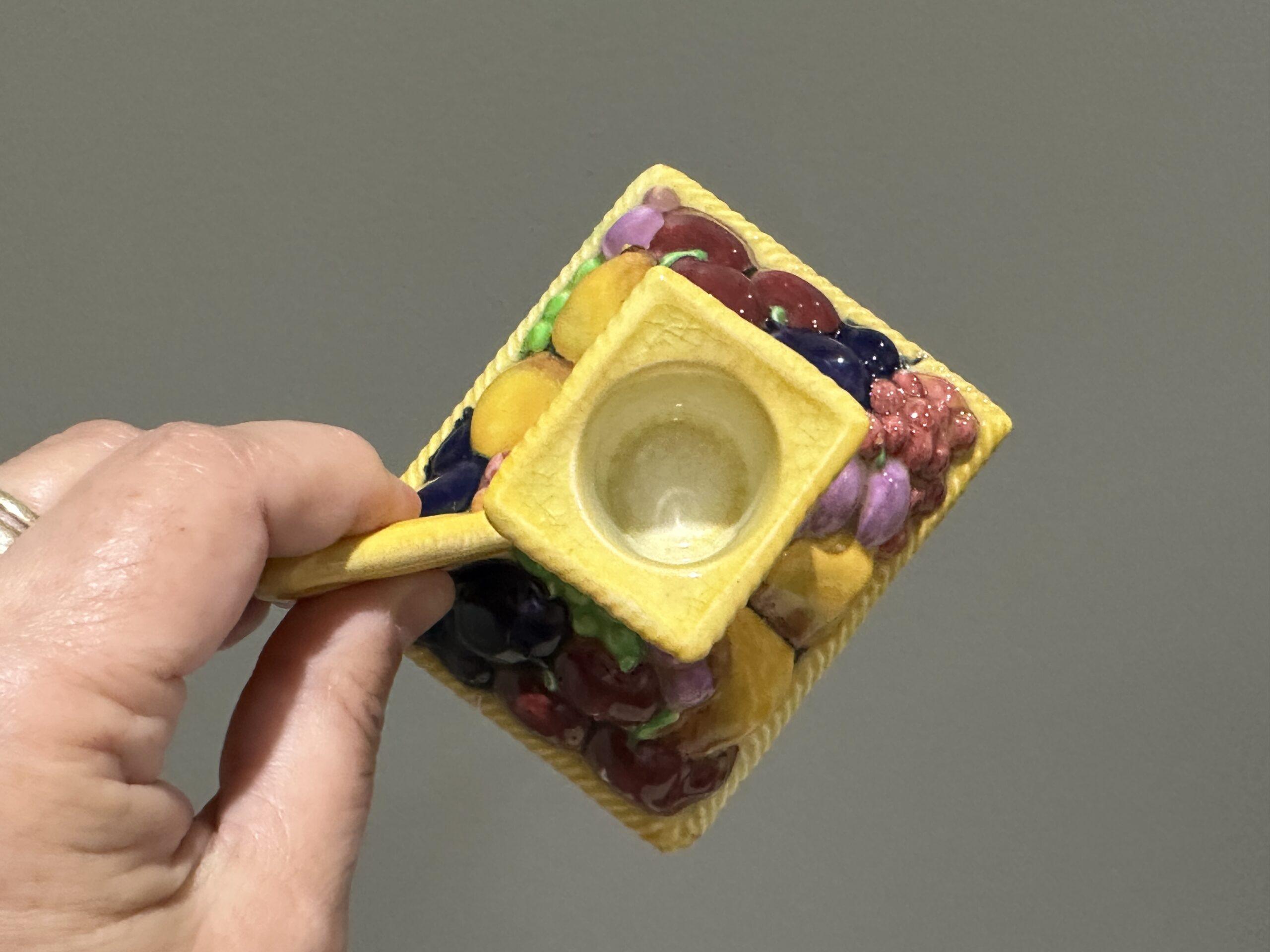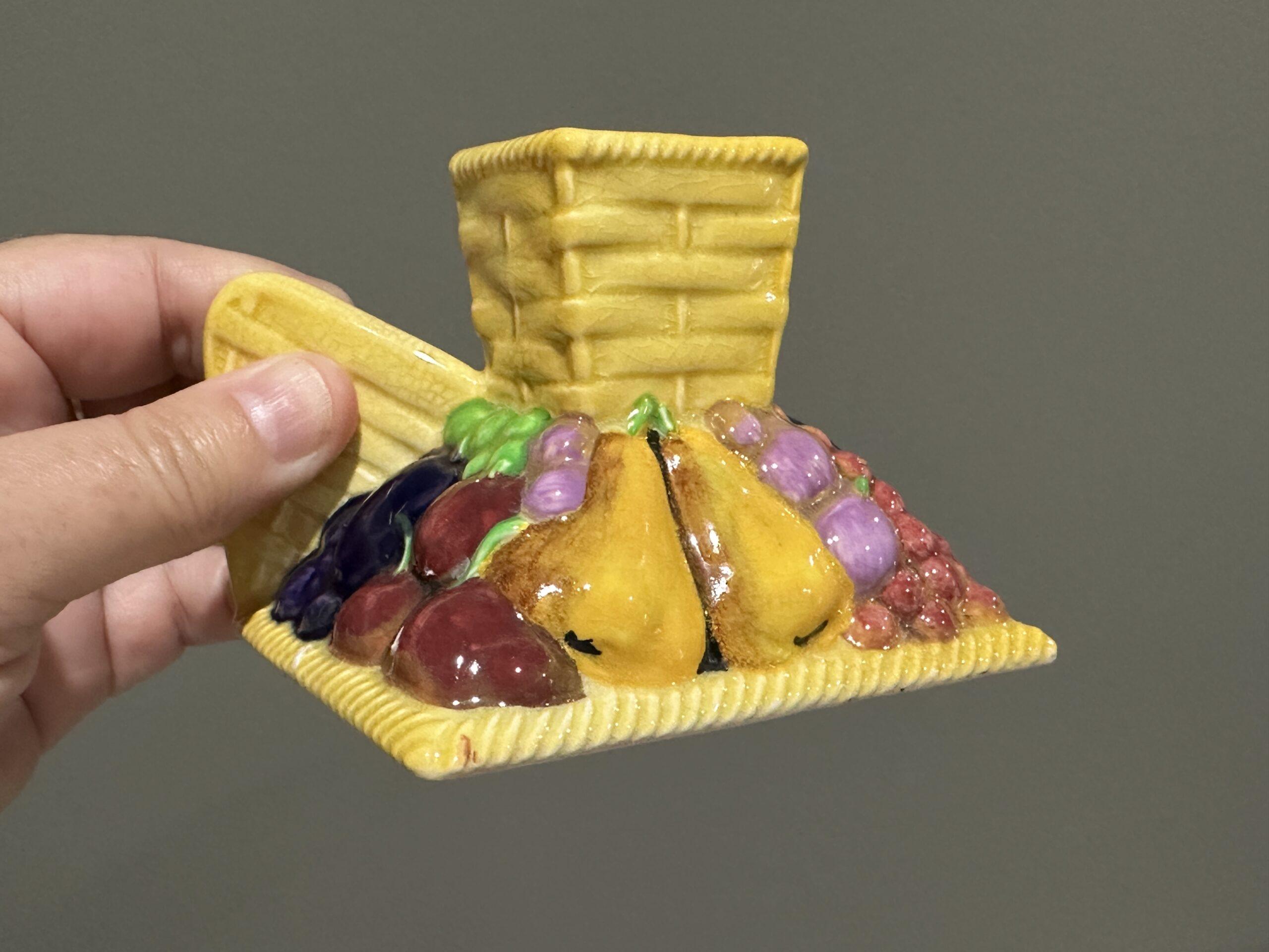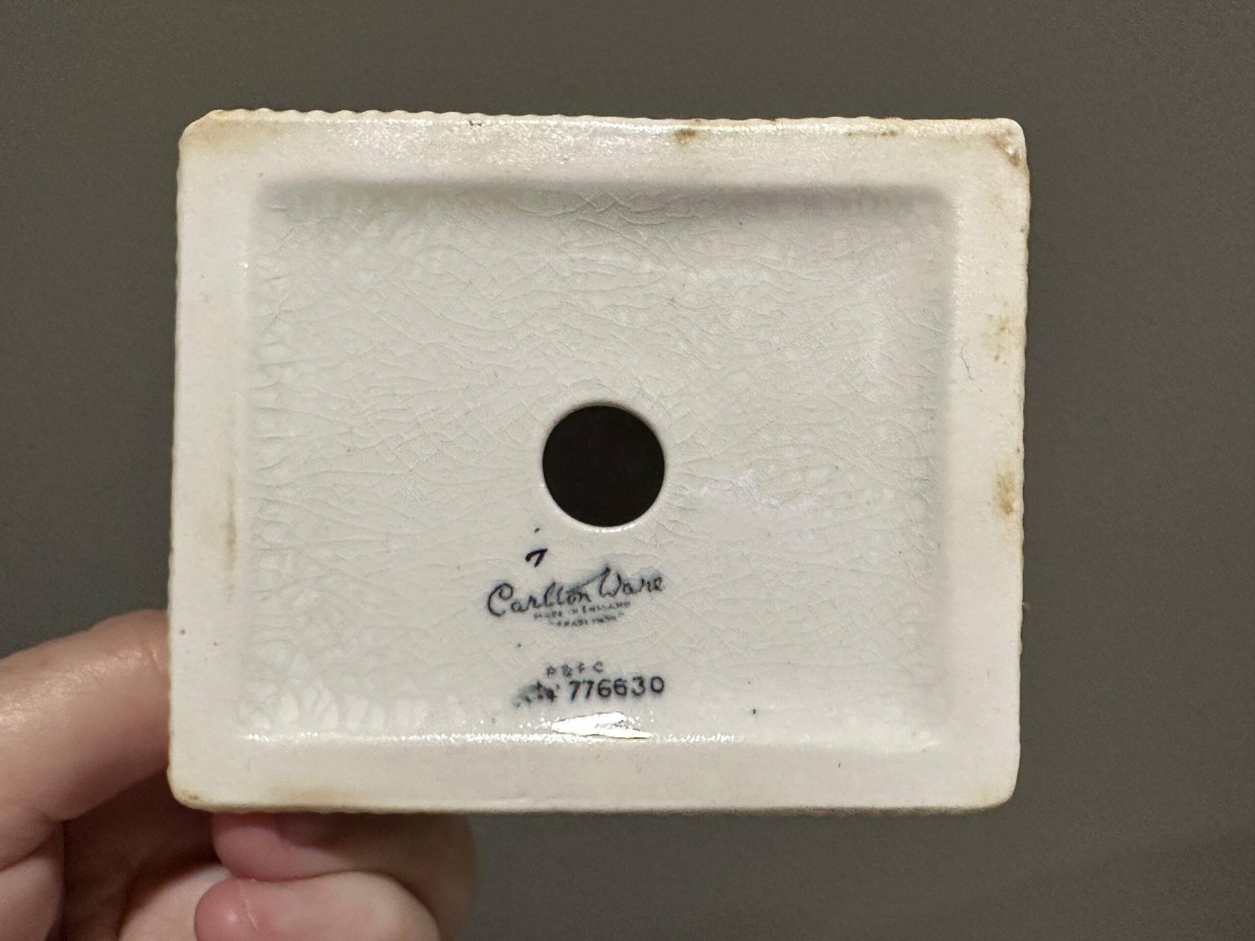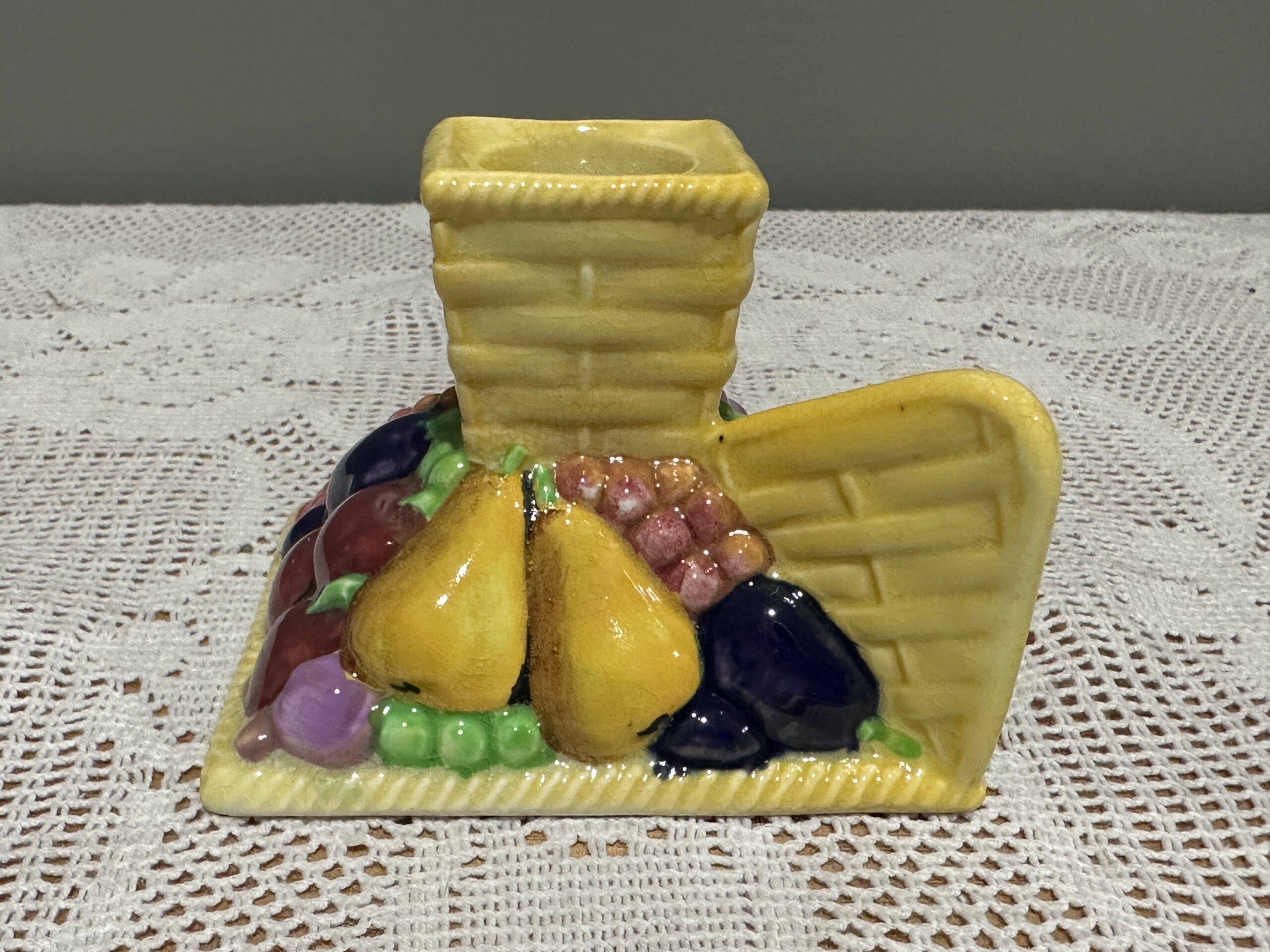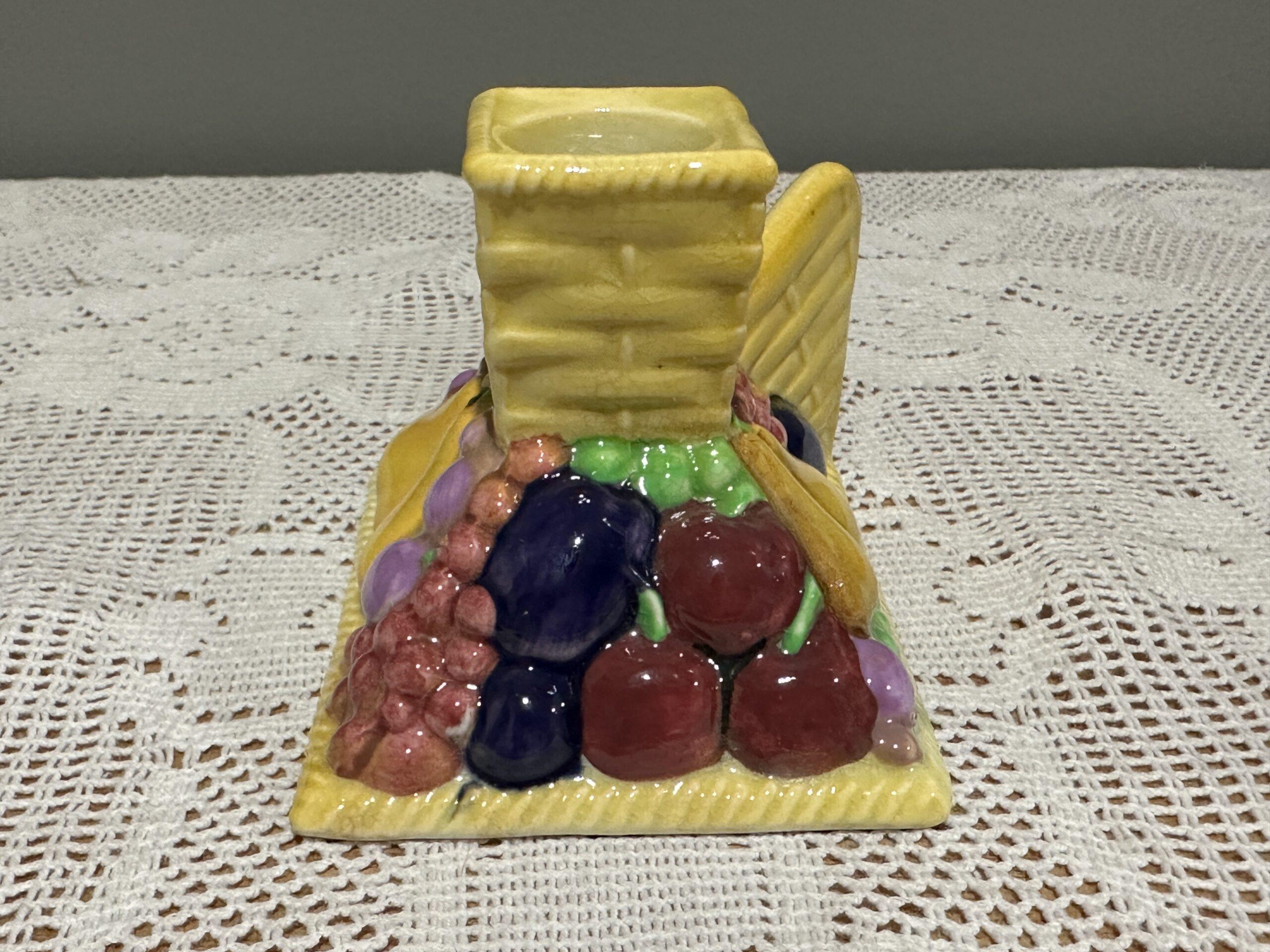 This lovely candle holder comes from Carlton ware. Dating to the art deco period, it features the fruit basket pattern. While the pattern is not so rare, it is hard to find on a candlestick. It measures 7.2 x 8.7cm at the base, 6.2cm in height, and is in great order with just clean crazing, mostly under the base.