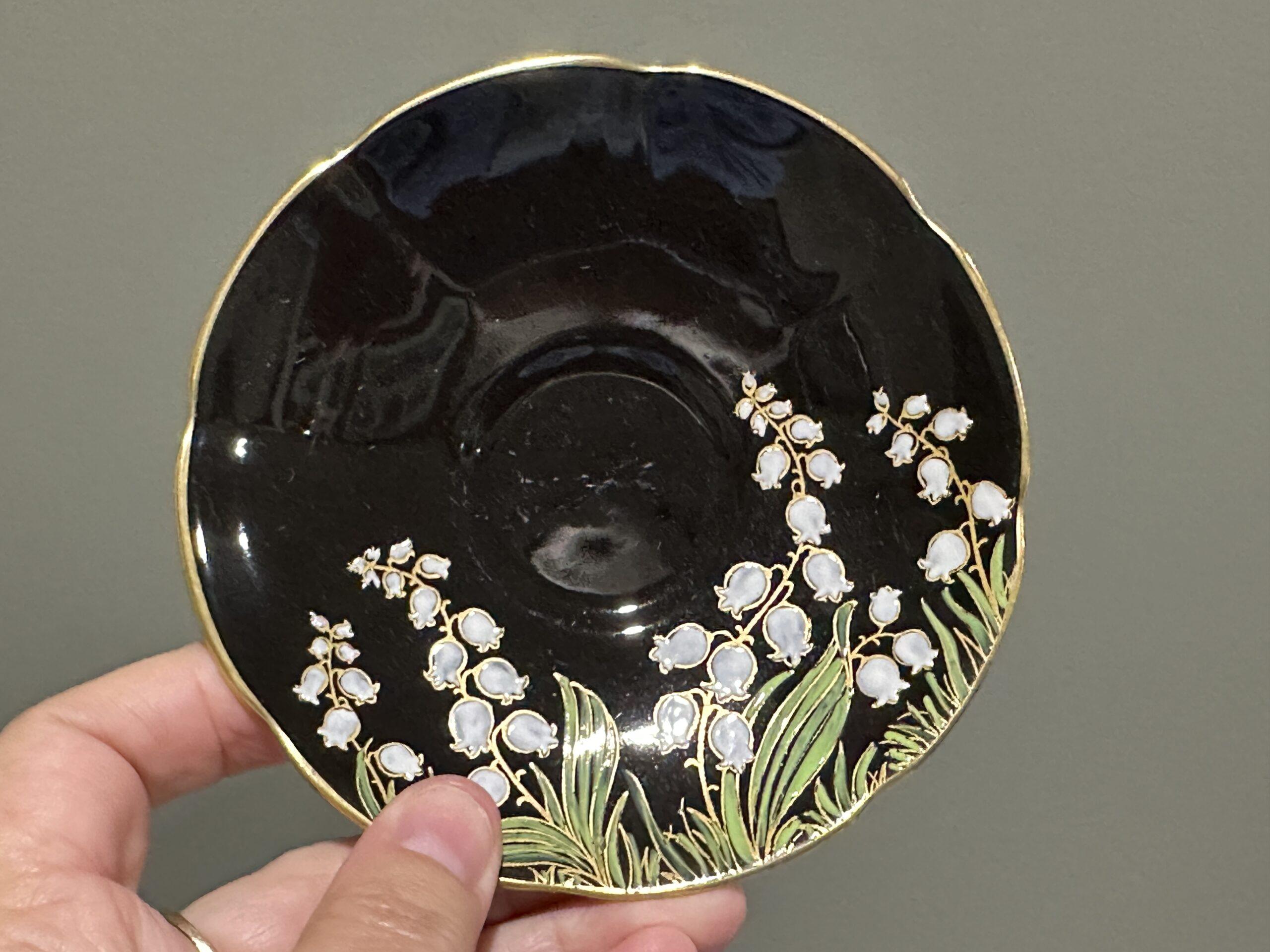 From Carlton Ware, this lovely little demitasse duo is simply stunning. From the Noire Royale range, it features hand enameled lily of the valley, with richly gilt trim and git interior. The cup measures 6.2cm diameter and 5.9cm in height, while the saucer is 11.2cm diameter. I have six sets available and the condition of most of the pieces is very good. There is just the odd tiny mark on the saucer or on the gilding inside the cup. Some pieces have a tiny bit of crazing under the cup. The best pieces will be picked out on a first come basis.