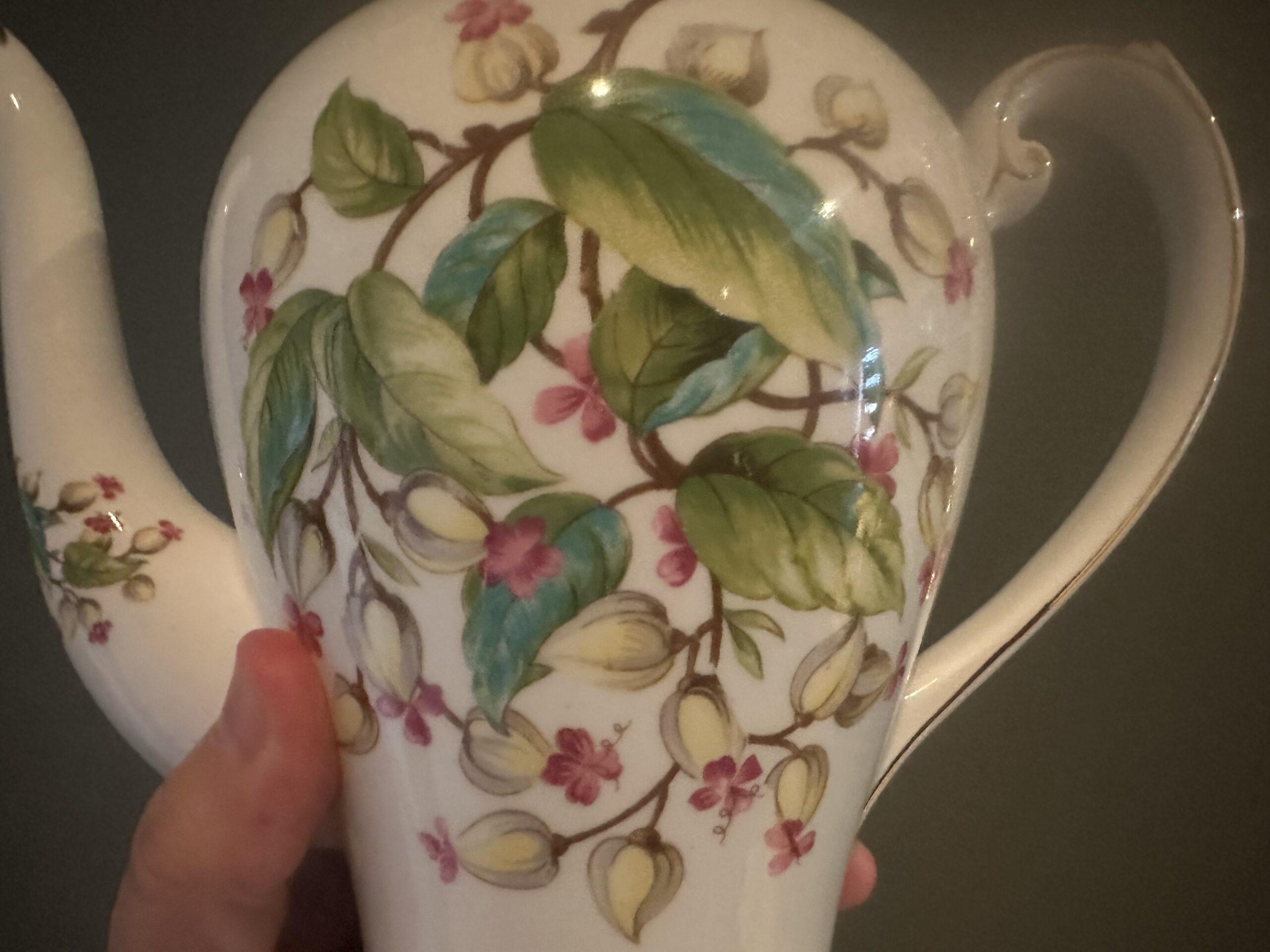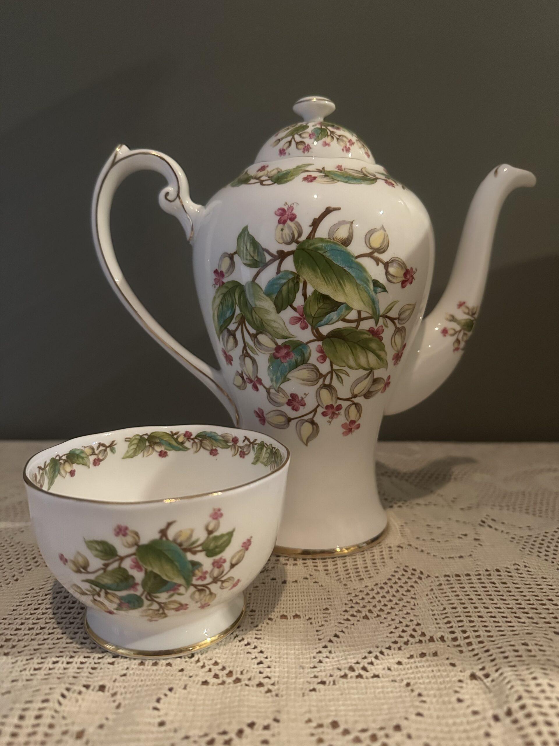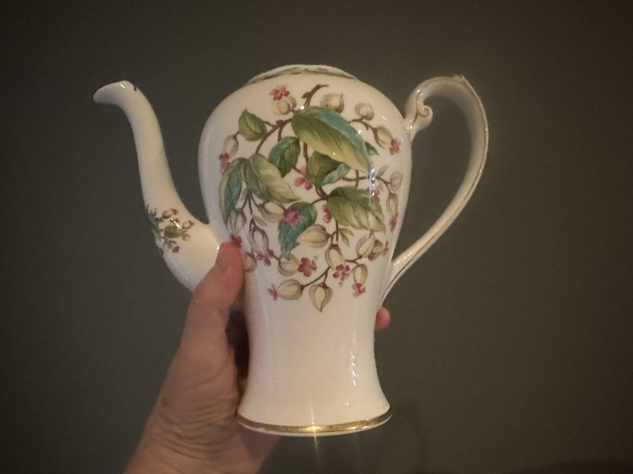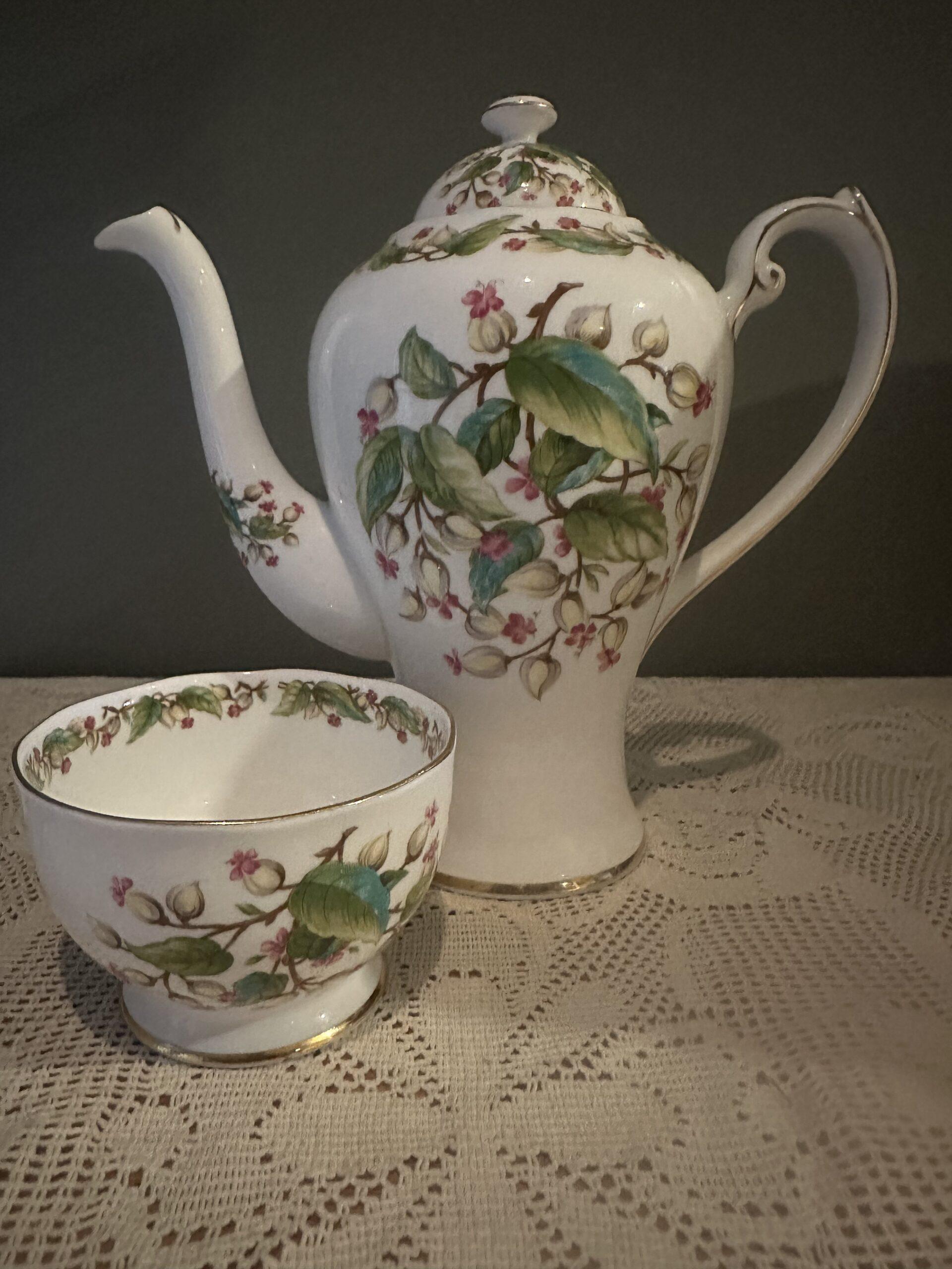 This lovely coffee pot and matching sugar bowl come from Roslyn china in the UK. They feature the stunning Linden Lea pattern. The pot measures 21cm from spout to handle and 221cm in total height, while the sugar bowl is 9cm diameter and 5.8cm in height. Both appear to have never been used.